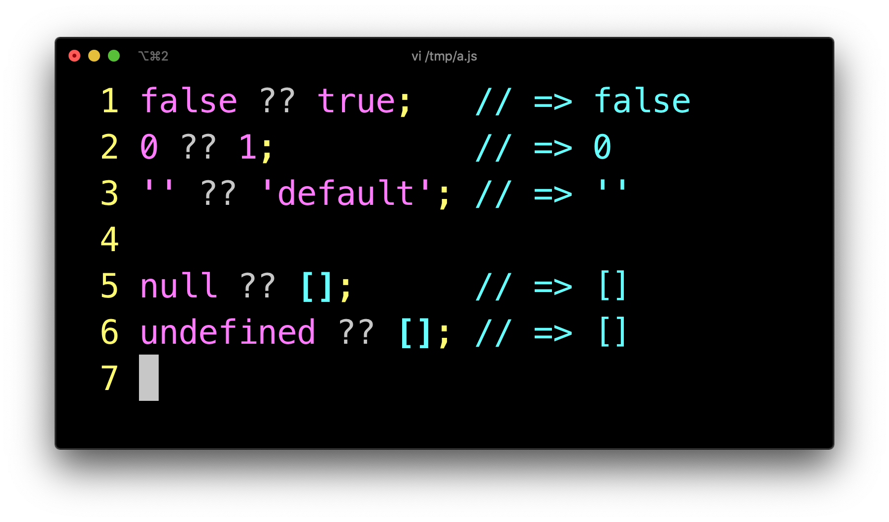 The nullish coalescing operator (??) acts very similar to the || operator, except that we don’t use "truthy" when evaluating the operator. Instead we use the definition of "nullish", meaning "is the value strictly equal to null or undefined". So imagine the expression lhs ?? rhs: if lhs is not nullish, it evaluates to lhs. Otherwise, it evaluates to rhs.