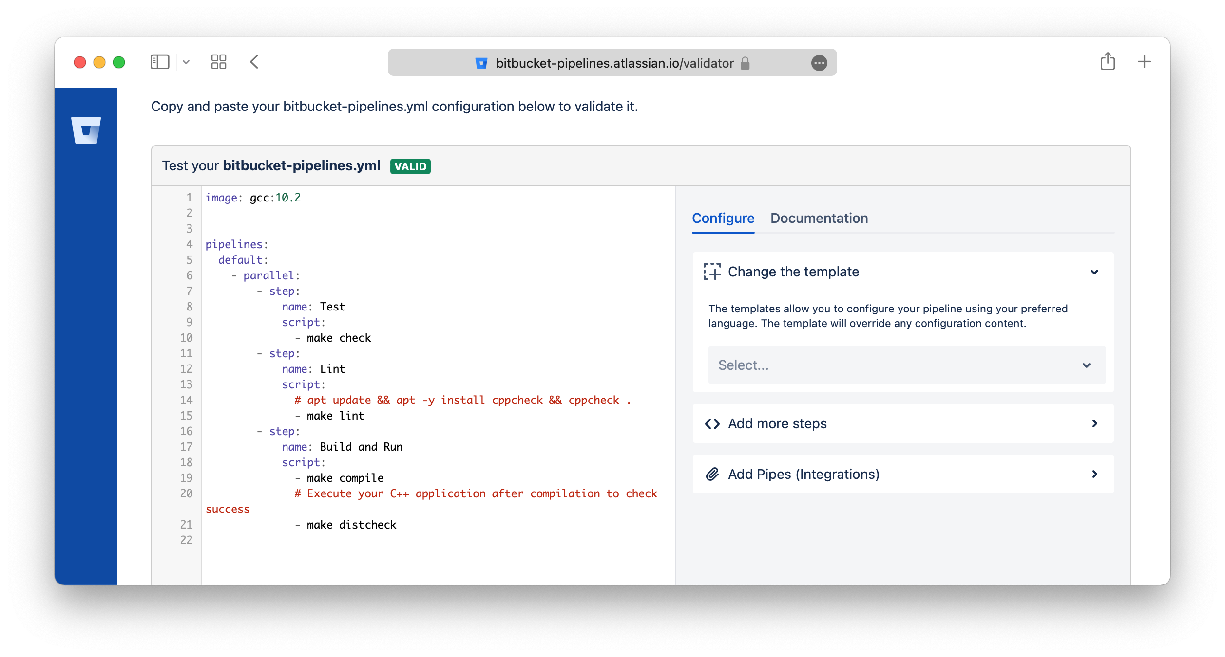 You can validate the bitbucket-pipelines.yml YAML format by using this tool: https://bitbucket-pipelines.atlassian.io/validator