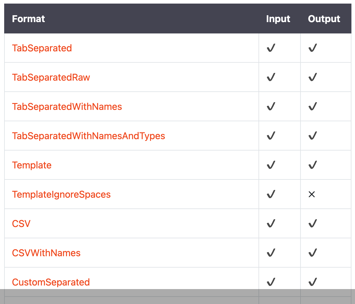 See the supported formats here: https://clickhouse.tech/docs/en/interfaces/formats/