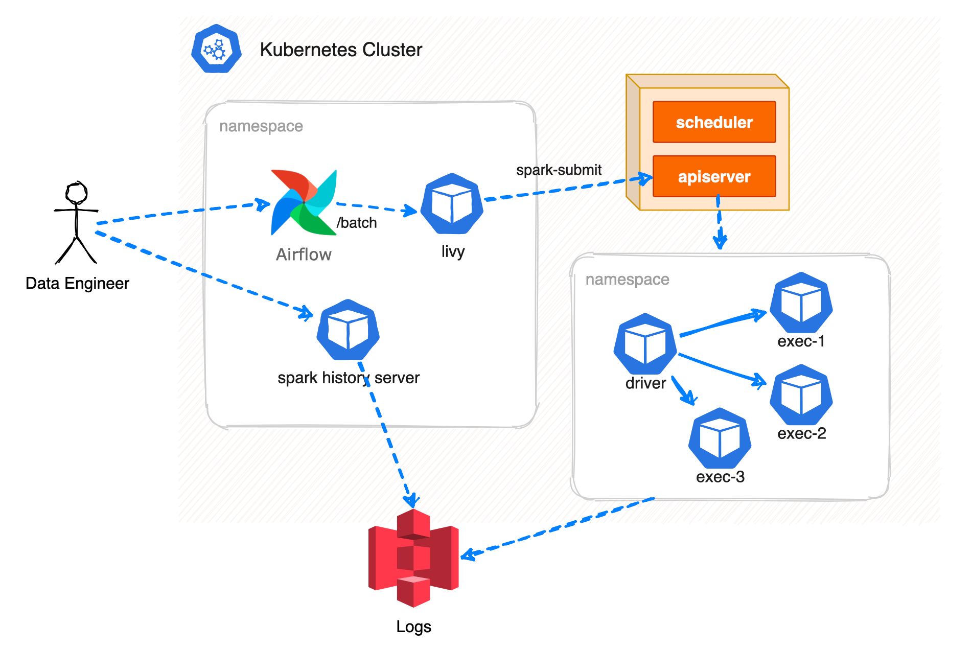 Nhu cầu để có thể submit một loạt jobs hàng ngày, team sử dụng Apache Livy trên Kubernetes, với kiến trúc như dưới đây: