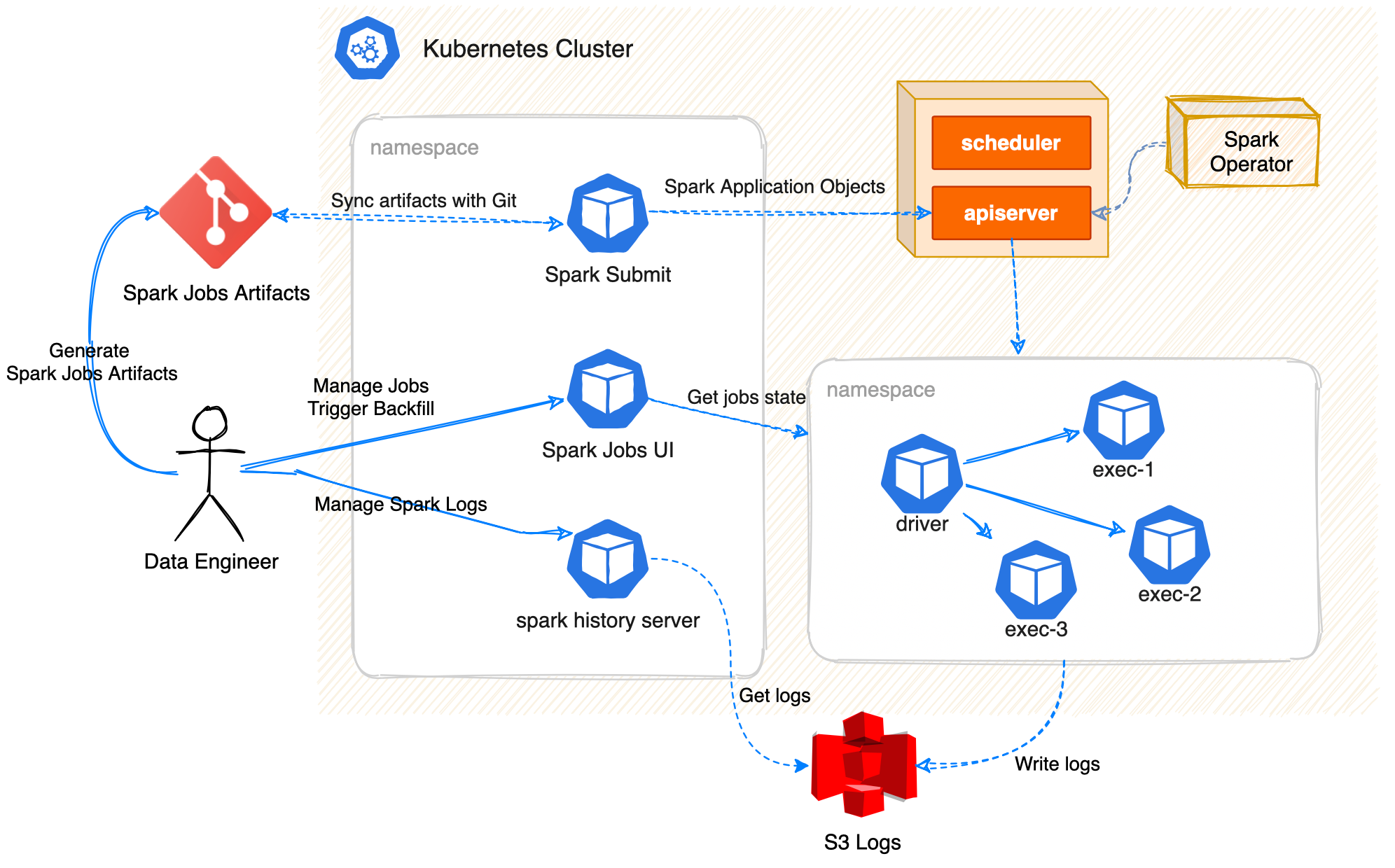 SparkApplicationvàScheduledSparkApplication. - (2) Spark Submit Worker là một Pod chạy trên Kubernetes, có nhiệm vụ đọc/sync những gì trên Git và apply vào Kubernetes thông qua Kubernetes API (hoạt động giống như