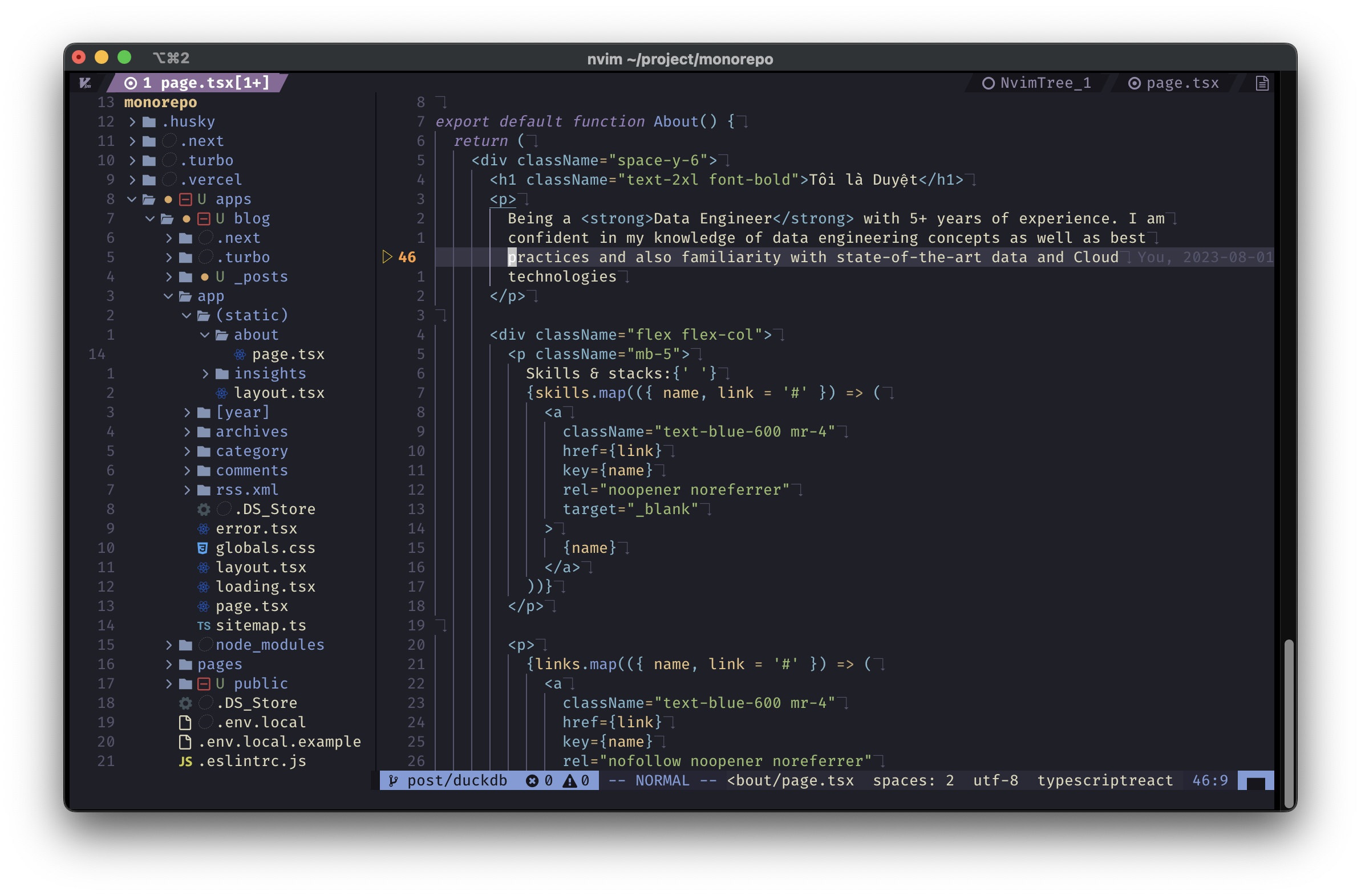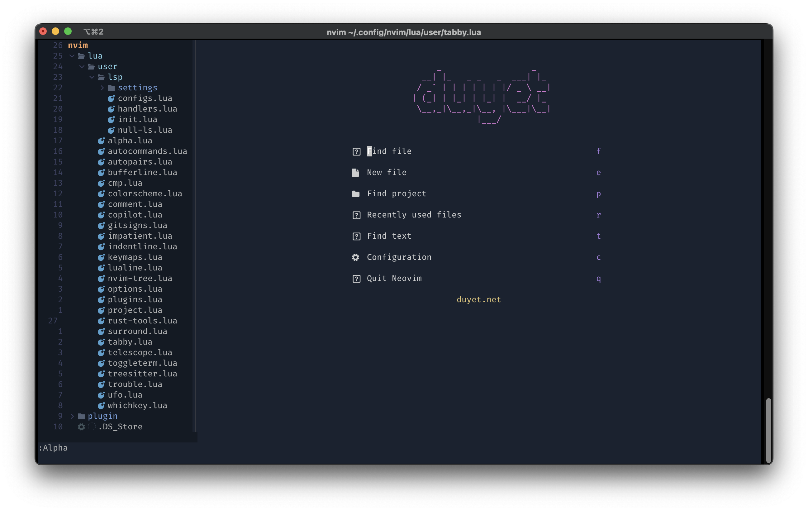 If you're interested in my setup, you can check out my repo at https://github.com/duyet/nvim. And if you want to use it for yourself, just clone the repo to your ~/.config directory using the following command: